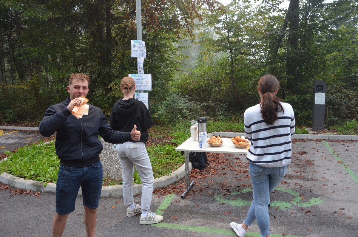 Vmes sta mimo točke energično pripešačili Tadeja in Dragica, ki vsako jutro tukaj prehodita daljši krog... in uspelo nam je malo polepšati njuno jutro: ,, Hvala, to je pa res prijetno presenečenje, sploh nisva pričakovali ! '' Glas o možnosti uporabe P+R bo prav gotovo tudi z njune strani prišel še do koga. Po še nekaj rogljičkih za ekspres obiskovalce parkirišča, pa se je prebudil tudi kamper z nemško registracijo. Iz nje nas je s svojo psičko pred, še posebej pa po jutranjem sprehodu, obiskal Tobias iz Munchna. S punco sta bila na poti iz Bosne nazaj domov. ,, Ta P+R je res zelo prijeten, tukaj med vemi gozdovi.'' je nasmejan pohvalil lokacijo njunega kratkega postanka.