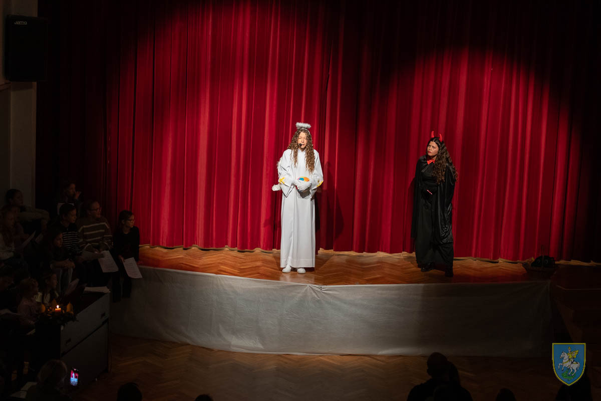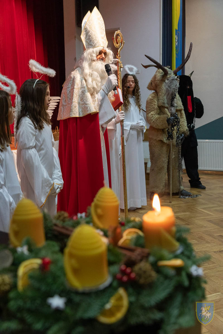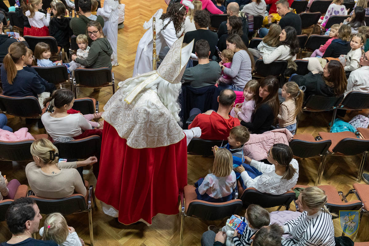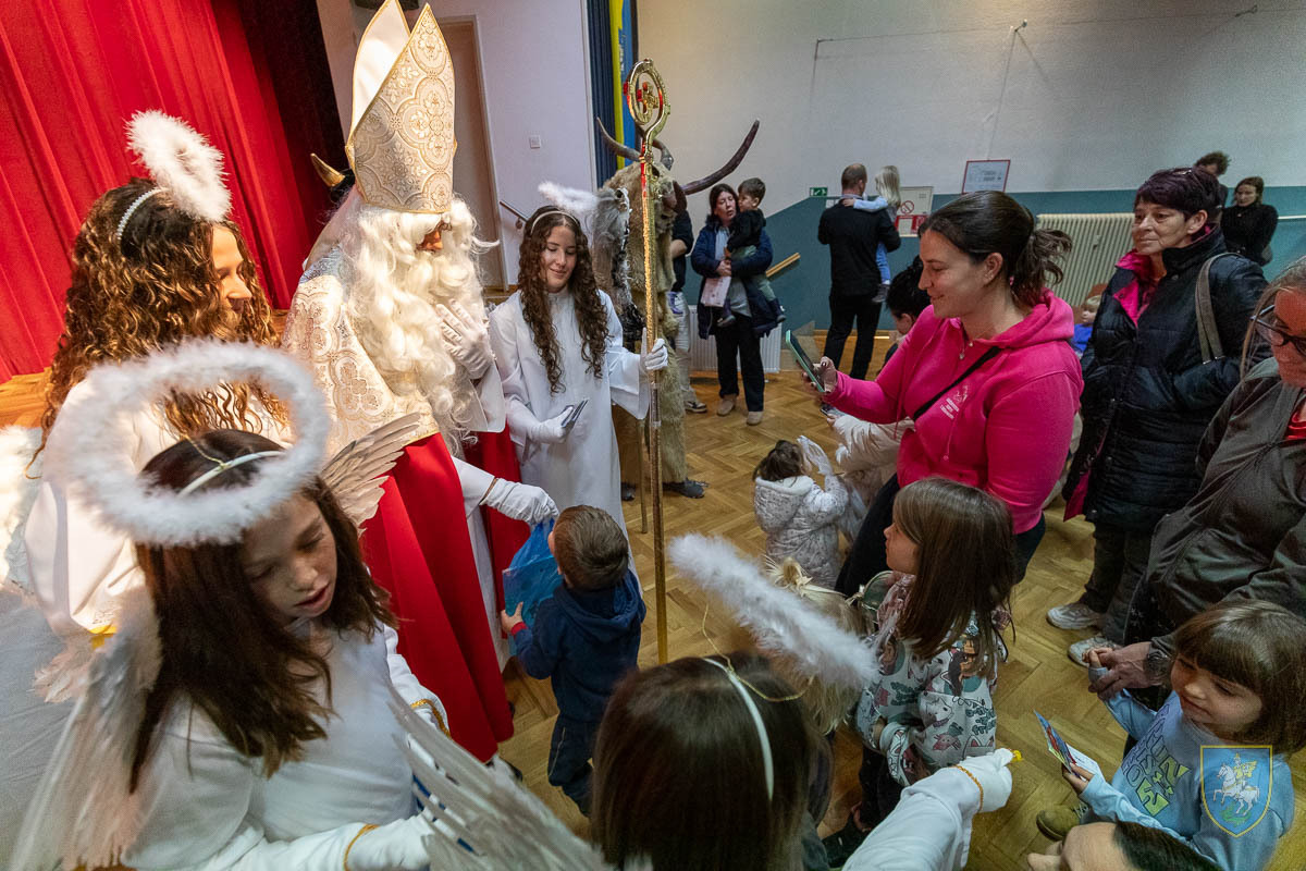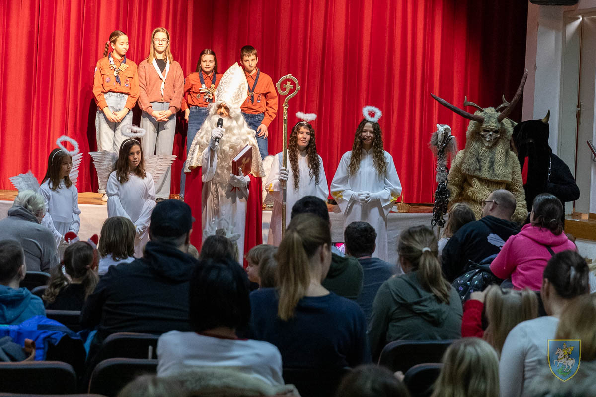 Po predstavi je sledil najbolj pričakovani trenutek – obisk svetega Miklavža. V spremstvu angelov in parkeljnov je prijazni svetnik nagovoril otroke, jih pohvalil za pridnost ter jih obdaril z darili. Angeli so s svojo toplino pričarali občutek miru, parkeljni pa so z nekaj nagajivosti poskrbeli za dodatno razburljivost, a brez strahu, saj je Miklavž ves čas skrbel za dobro voljo.