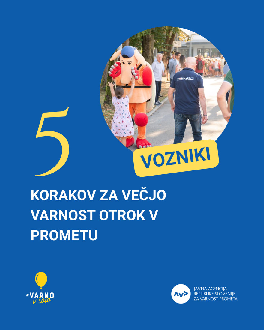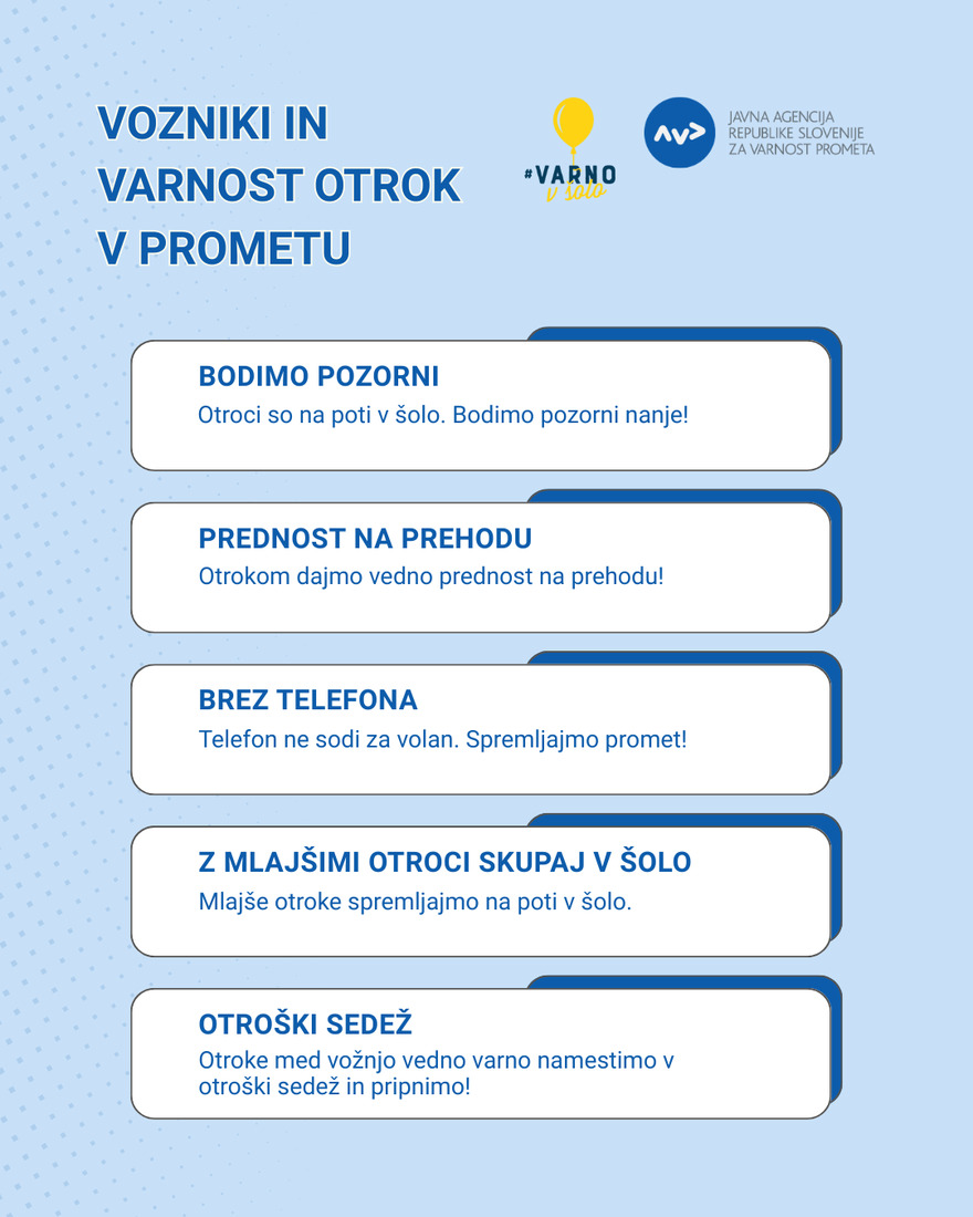 Voznice in voznike v naši občini pozivamo, da v bližini šol, vrtcev, avtobusnih postajališč in prehodov za pešce vozijo počasneje, previdno in strpno. Še posebej to velja v jutranjih in popoldanskih urah, ko so otroci na poti v šolo ali domov.