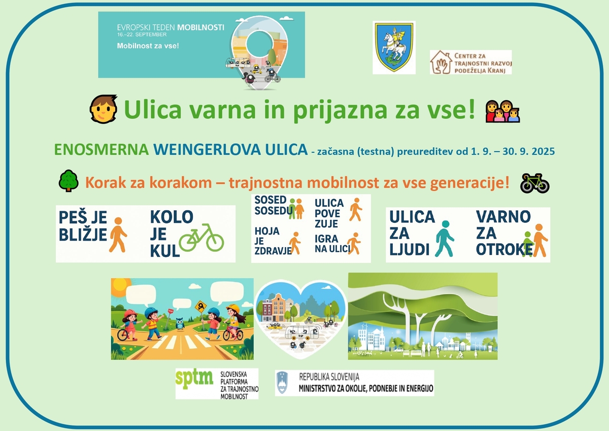 V okviru aktivnost je Weingerlova ulica v septembru začasno (testno) preurejena v enosmerno ulico. Vožnja je dovoljena le iz smeri Pipanove ceste proti domu starejših Šenčur (prikaz smeri v prilogi). Iz nasprotne smeri je vožnja dovoljena le do uvoza na parkirišče doma starejših.