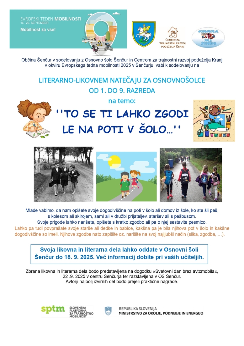 Občina Šenčur v sodelovanju z Osnovno šolo Šenčur in Centrom za trajnostni razvoj podeželja Kranj v okviru Evropskega tedna mobilnosti 2025, vabi k sodelovanju na LITERARNO-LIKOVNI NATEČAJ ZA OSNOVNOŠOLCE na temo:
