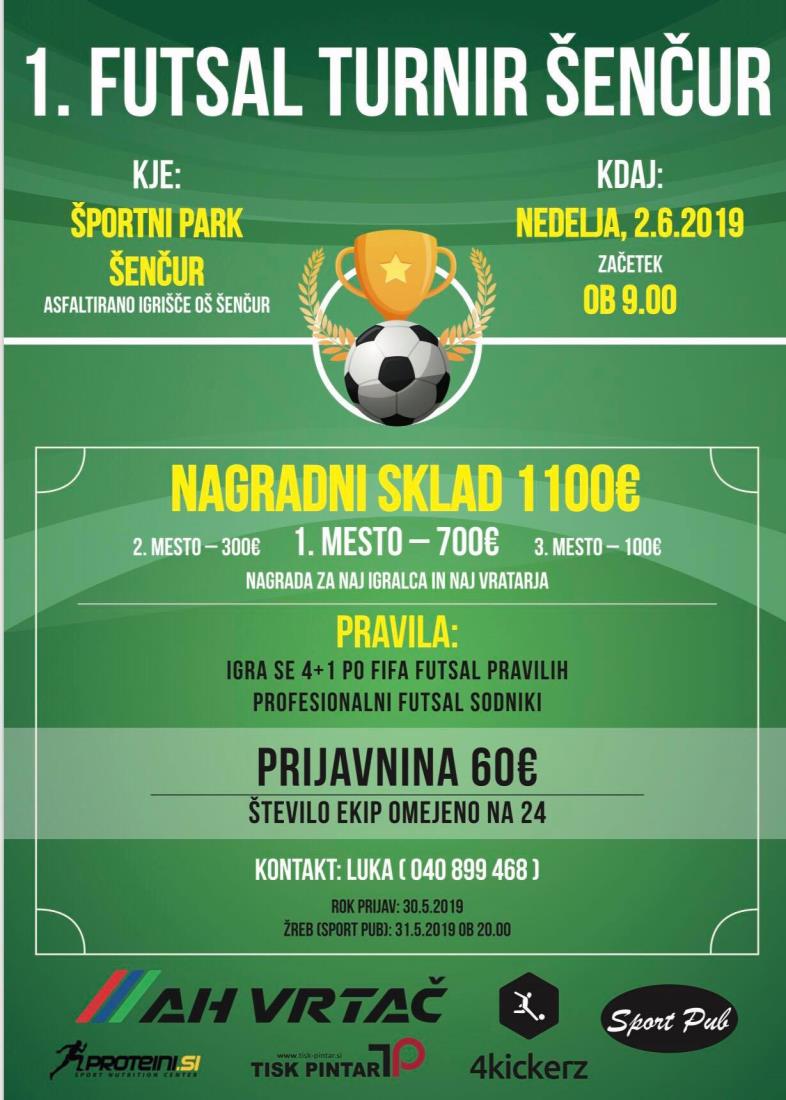 V športnem parku Šenčur bo v nedeljo, 2.6. 2019 potekal 1.Futsal turnir Šenčur. Igral se bo pravi futsal, saj bo potekal po pravilih te igre.