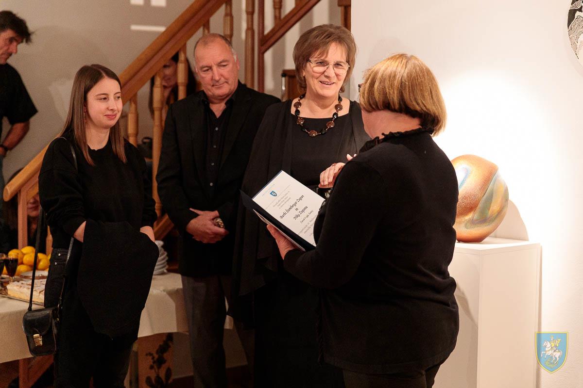 Zahvalo listino za pripravljeno razstavo v muzeju Šenčur je Zavodu V-oglje in ga.Barbi Š. Zupan izročila predsednica Odbora za kulturo pri Občini Šenčur ga. Slavka Weisseisen
