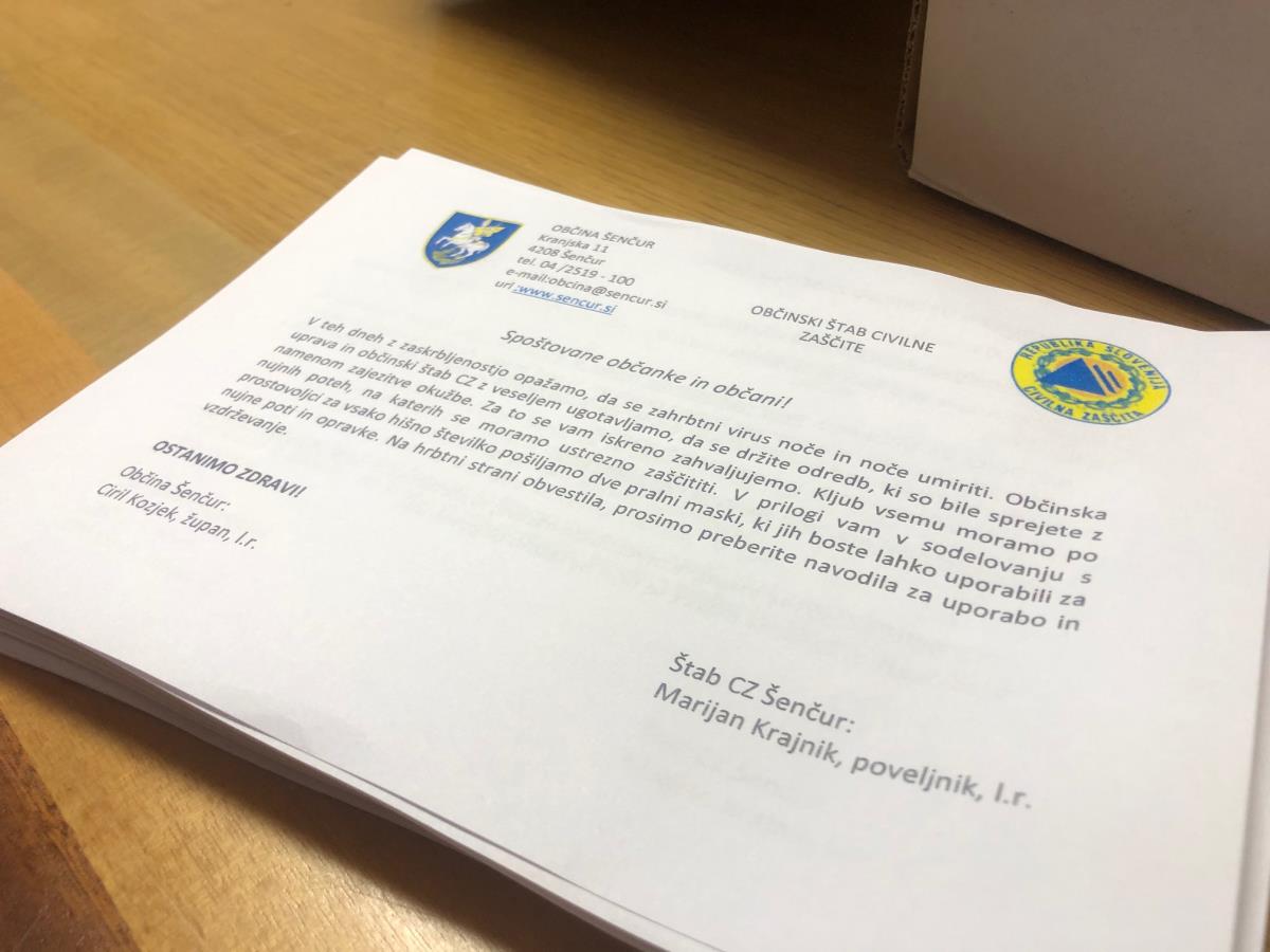 Včeraj se je po občini Šenčur začelo razdeljevanje zaščitnih mask, katere so prostovoljno sešile šivilje. Vsako gospodinjstvo bo prijelo dve maski za večkratno uporabo. Maske bodo po gospodinjstvih, prav tako prostovoljno, raznosili predsedniki in člani vaških - krajevnih skupnosti. Nekatera naselja so jih že prijela, ostala pa jih bodo predvidoma do konca tedna. Poleg boste prejeli tudi kratka navodila za pravilno uporabo in vzdrževanje le teh.