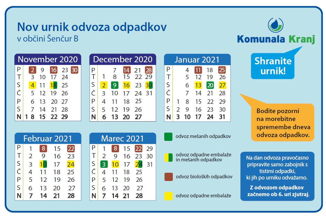 S 1. 11. 2020 začnejo veljati novi urniki rednega odvoza odpadkov za obdobje november 2020-marec 2021. Poti do razporeda odvozov so naslednje: