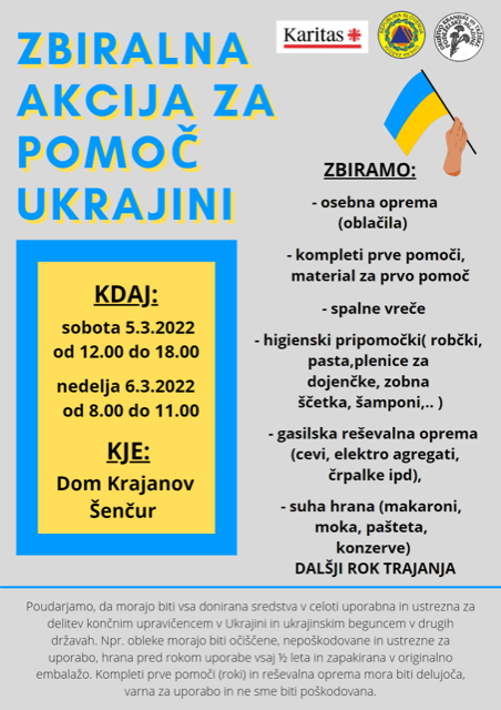 Društvo kranjske in tržiške podeželske mladine Kranj, Karitas in Civilna zaščita pripravljajo Zbiralno akcijo za pomoč v Ukrajini, ki bo potekala v soboto, 5. 3. 2022, in nedeljo, 6. 3. 2022, v Dom krajanov Šenčur.