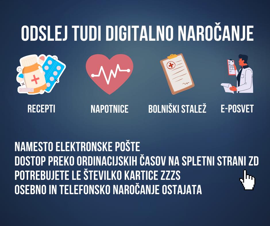 ZD Kranj, eden največjih ZD-jev v Sloveniji in daleč največji na Gorenjskem, težak za slabo polovico preostalega gorenjskega osnovnega zdravstva, prehaja na digitalno servisiranje najbolj pogostih zdravstvenih storitev. Pomembno je poudariti, da je nov način le dopolnilen in ne pomeni poseganja v najpomembnejšo komunikacijo - fizičen stik med zdravnikom in pacientom – to je osebno in telefonsko komuniciranje. Pacienti, ki ne uporabljajo digitalnih poti, bodo do zdravnika še vedno dostopali tako kot doslej. Obenem nov način omogoča, da digitalne storitve namesto njih opravijo njihovi bližnji.