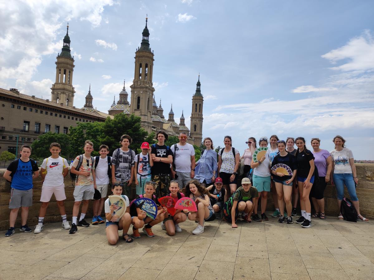 V tednu od 17. do 24. junija smo našim španskim prijateljem vrnili obisk. Sedmošolci naše šole so v spremstvu učiteljev Ane Marija Rožman, Maruše Robida, Katje Golouh, Štefke Svetelj, Urše Tomažič in Boštjana Gradišarja odpravili v Španijo, kjer smo bili gostje na naši partnerski šoli. Skupaj s španskimi učenci smo sodelovali na delavnicah na njihovi šoli, si ogledali mesto Zuera in srednjeveško mestece Alquézar ter se odpravili na pohod po soteski reke Vero. Spoznavali smo špansko zgodovino, kulturo in običaje. Z lokalno plesno skupino smo spoznavali tipične španske plese ter nekaj pridiha domače kulture predstavili tudi njim. Ugotovili smo, da imamo skupnega zavetnika, sv. Jurija, in jim podarili zastavo naše občine. Na zaključni prireditvi v šoli pa so se naši sedmošolci predstavili s slovenskim tradicionalnim plesom, polko.