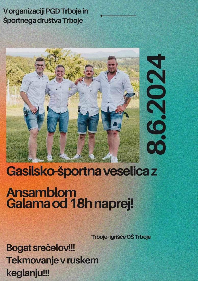 Člani PGD Trboje in ŠD Trboje vabijo na "Gasilsko športno veselico", ki bo v soboto, 8.6.2024, od 18h naprej z ansamblom Galama.