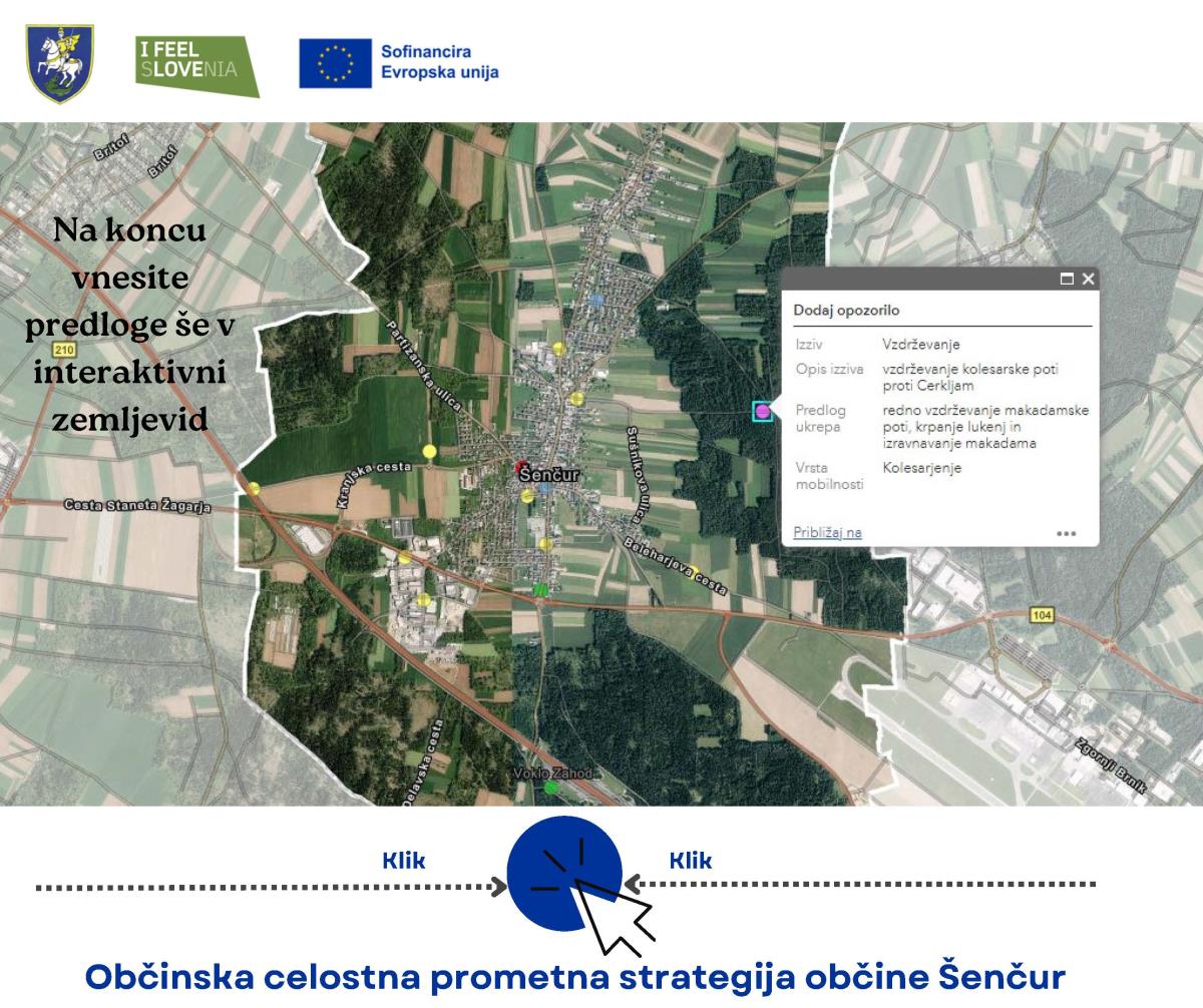 Občina Šenčur pripravlja Občinsko celostno prometno strategijo (OCPS), ki bo podlaga za načrtovanje in izvedbo ukrepov s področja trajnostne mobilnosti v lokalnem okolju. Z vašo pomočjo želimo oblikovati trajnostno prometno strategijo, ki bo naslavljala vse oblike mobilnosti (hojo, kolesarjenje, javni potniški promet in osebna vozila) ter prispevala k izboljšanju kakovosti bivanja.