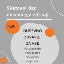 vsako leto 10. oktobra obeležujemo Svetovni dan duševnega zdravja z namenom ozaveščanja o pomembnosti duševnega zdravja in spodbujanja preventivnih ukrepov. Letošnje geslo Svetovne zdravstvene organizacije se glasi: